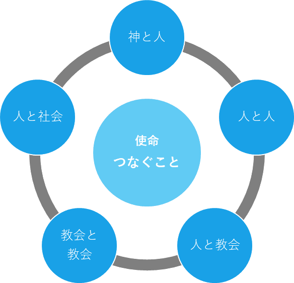 私たちは、福音の使者・大使として、キリストにある「つながり」「つなげる」「CONNECTING」のメッセージを個人に、社会に伝え、運ぶことを使命としています(第2コリント5章20節)。その「つながり」とは、具体的に、①神と人、②人と人、③人と教会、④教会と教会、⑤人と社会、⑥教会と社会、等々のつながりです。